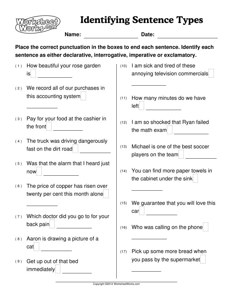 This fantastic worksheet features a series of activities for your children to complete, showing how well they know the different types of sentences found . Identify eachsentence as either declarative, . Aidentifyingname:sentence typesdate:place the correct punctuation in the boxes to end each sentence. The exclamatory sentence expresses strong feeling. With this writing resource, help your els familiarize themselves with the four sentence types: